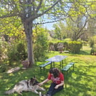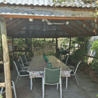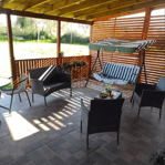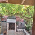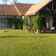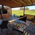 Terraza con áreas verdes, quincho, parrón y frutales.
